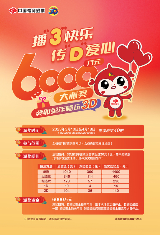 為回饋廣大購(gòu)彩者對(duì)福彩3D游戲的喜愛(ài)與支持,江蘇省福利彩票發(fā)行中心決定開(kāi)展2023年3D游戲6000萬(wàn)元派獎(jiǎng)活動(dòng)?,F(xiàn)就有關(guān)事項(xiàng)公告如下: